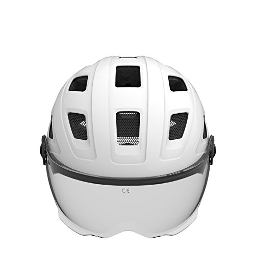 Brille dabei aber Sonnenbrille vergessen? Mit dem Hyban+ kein Problem. Einfach das außen anliegende, großzügige Visier über die Brille ziehen und die freie Sicht genießen. Das ist ein echtes Plus. Besonderheiten: Fliegennetz Einsatzzweck: City / Commuting Visier/Schirm: Scheibe Details: – Schlagfestes, großflächiges Visier mit Tönung zum Schutz vor Fahrtwind und Insekten – Großes, hoch angebrachtes und integriertes LED-Rücklicht mit 180° Sichtbarkeit Gurtverstellsystem Materialangaben: ABS Hartschalentechnologie Polster: herausnehmbare und waschbare Polster mit höchstem Tragekomfort Verschlusssystem: Fidlock-Magnetgurtschloss Visier/Schirm abnehmbar Konstruktion: Schalenkonstruktion Verstellsystem: Zoom Evo Easy – feinjustierbares Verstellsystem mit griffigem Verstellrad Belüftungsöffnungen Anzahl: 18 Stück