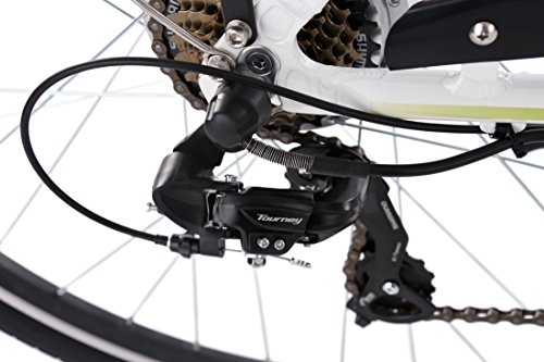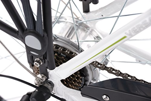 Das ADORE City-E-Bike VERSAILLES ist der perfekte Einstieg in die E-Mobilität!Der Lithium-Ionen-Akku hat bis zu 60 km Reichweite (abhängig vom Gelände). Nach 6-8 Stunden ist der Akku wieder vollständig geladen.Der bürstenlose Gleichstrom-Motor im Hinterrad schaltet sich gemäß StVZO ab einer Geschwindigkeit von 25 km/h oder bei Betätigung der Bremsen automatisch ab. Sie können zwischen 4 Unterstützungsleveln wählen sowie den Akkuladezustand über drei Leuchtdioden überwachen. Wenn die Unterstützung nicht benötigt wird, kann sie abgeschaltet werden, um die Akkuleistung zu verlängern. Rahmen: Aluminium, 48 cmMotor: Bürstenloser Gleichstrommotor 36V / 250WAkku: Li-Ion, 36V / 10,4 Ah, Kapazität 374,4 WhLadezeit: 6-8 StundenDisplay: ADORE Tongshen LED-Display 4levelsGeschwindigkeit: 25 km/h Gabel: Federgabel mit 1 1/8″-GabelschaftSteuersatz: Integrierter SteuersatzVorbau: Aluminium-Schaftvorbau, verstellbarLenker: AluminiumNaben: Aluminiumnabe vorne, bürstenloser Gleichstrommotor hintenFelgen: 6061 Aluminium-Hohlkammerfelgen Reifen: CST Traveller 42-622 (700-40c)Gänge: 7-Gang-Kettenschaltung Schaltwerk: SHIMANO TourneySchalthebel: SHIMANO SL-RS35 Tourney RevoShift DrehschaltgriffRitzel: SHIMANO MF-TZ 21 Schraubkranz, 7-fach (12-28 Zähne)Kurbel: Aluminiumkurbeln, Kettenblatt 42 ZähneInnenlager: BSA PatronenlagerSattelstütze: Aluminium-Patentsattelstütze ø 27,2 mmSattelklemmung: Aluminium-Klemmring mit SchnellspannhebelBremse: Aluminium-V-BrakesBremshebel: AluminiumScheinwerfer: SPANNINGA Micro FF LED mit integriertem ReflektorRücklicht: SPANNINGA Linea LEDZubehör: Akku-Ladegerät, GepäckspanngurteGewicht: ca. 23 kg