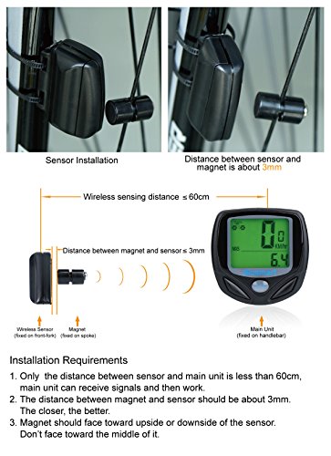 Es sind 2 Link auf YouTube zum Installieren und Einrichten dieser Fahrradcomputer: Installations-Link: https://youtu.be/q42CfYEMTtk Verbindung herstellen: https://youtu.be/fVUVZpCdO4U Bevor Sie es kaufen, bitte wissen, dass etwas in Computer Rasseln, weil, da ist ein Bewegungssensor-Schalter in innen. Dieser Zyklus Computer automatisch aufwachen, wenn irgendein Signal eingegeben oder eine beliebige Taste gedrückt wird. FUNCTIONS SPD Current Speed ODO Odometer (0-9999km/m) DST Trip Distance MXS Maximum Speed AVS Average Speed TM Elapsed Time CLK CLOCK (12H/24H) SCAN COMPARATOR SETTING SPEED SCALE (km/h, m/h) SETTING TYRE CIRCUMFERENCE (0-9999mm) SETTING THE LAST VALUE OF ODOMETER/ODO FREEZE FRAME MEMORY AUTO ON/OFF SIGNAL INTERFERENCE-RESISTANCE BACK LIGHT Einführung Packungsinhalt 1.1 Computer (Hauptgerät) × 1St 1.2 Sensor × 1St 1.3 Untere Halterung × 1St 1.4 Gummiring × 1St 1.5 CR2032 Batterie × 1St 1.6 3.0V Batterie × 1St 1.7 Magnet × 1St 1.8 Kabelbinder × 6St