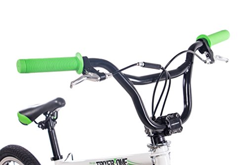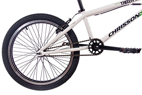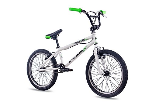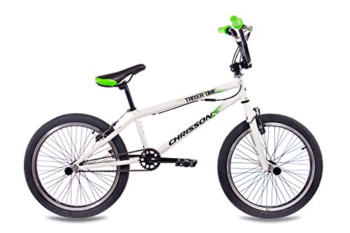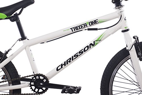 RAHMEN: CHRISSON TRIXER ONE – HI-TEN Stahlrahmen / Rahmenhöhe: 25cm GABEL: GW YS 07 – Stahlgabel STEUERSATZ: CC 878 F 360º Rotor System – Lenkersteuersatz ? 1 & 1/8 / 360 Rotor KETTENRAD, vorne: GW 142 – 25 Zähne, Stahlkurbel in schwarz KETTE: P 51 OH – 92NPPEDALE: FEIMIN FP-850B 1/2’NABEN: GW – 10mm verstärkte Achse LEERLAUF: GW 16T – 16 Zähne 1/2 x 1/8& FELGEN: SPEED schwarz – Alufelgen / HochflanschSPEICHEN: SLEE – 48 Speichen 14G W/CP mit 12mm Speichennippel REIFEN: KENDA K841 – 20 x 1.95, schwarz LENKER: GW YL-865 Stahl, Breite: 660mm GRIFFE: HL-G105 – grün / Freestyle VORBAU: AHEAD – 50mm extern für 360 Rotor SATTEL: P802C – BMX CORE Style Sattel SATTELSTÜTZE: GW – Stahl, Länge: 300mm, ? 25,4mm SATTELKLEMME: PROMAX – schwarz ALU Körper VORDERBREMSE: VB-967DK ALU V-Bremse HINTERBREMSE: VB-967DK ALU V-Bremse BREMSHEBEL: VBL-09A – Aluminium schwarz 2 Finger Verpackung: Fabrikneu und Originalverpackt! Um eventuelle Transportschaden zu vermeiden, sind die Fahrräder nicht zu 100%, sondern zu 85% vormontiert! Sie müssen nur noch Lenker, Pedale, Vorderrad und Sattel montieren. In seltenen Fällen ist auch leichtes Nachjustieren notwendig. Eine Montageanleitung bekommen Sie in elektronischer Form (PDF) nach dem Kauf.