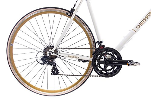 CHRISSON VINTAGE ROAD 2.0 – Ein TOP Vintage Rennrad mit modernster Technik!Wir haben bei diesem unglaublich schönen Vintage Rennrad die komplette SHIMANO A070 Gruppe verbaut! TECHNIK: RAHMEN: HI TEN Vintage Rahmen mit Unterlackdekoren matt / Rahmenhöhe: 53cm, 56cm, 59cmGABEL: HI TEN Gabel STEUERSATZ: NECO 845 1 1/8KETTENRAD, vorne: SHIMANO A070 Aluminium schwarz 34-50 Zähne, 170mmKETTE: KMC Z 50PEDALE: FEIMIN Kunststoff- AluminiumSCHALTWERK: SHIMANO RD A070UMWERFER: SHIMANO FD A050SCHALTHEBEL: SHIMANO SL A 070 7R/2L 14 Gänge Brems-SchalthebelRITZELPAKET: SHIMANO TZ21 Mehrfacher Leerlauf in allen 7 GängenFELGEN: CHRISSON Aluminium AEROSPEICHEN: SLEE blackREIFEN: SCHWALBE LUGANO 700x23C schwarz cremeLENKER: PROMAX HB 2035 Stahl, Breite: 440mmGRIFFE: HERRMANS LenkerüberzugVORBAU: ZOOM C80 AHEADSATTEL: LIBERTY Rennsattel Made in ItalySATTELSTÜTZE: ZOOM SP 232 Aluminium Länge:300mm, Ø 27,2mmSATTELKLEMME: ZOOM AluschelleVORDERBREMSE: PROMAX Aluminium, DUAL PIVOT RennbremseHINTERBREMSE: PROMAX Aluminium, DUAL PIVOT RennbremseBREMSHEBEL: SHIMANO A070 VERPACKUNG: Fabrikneu und Originalverpackt! Um eventuelle Transportschaden zu vermeiden, sind unsere Fahrräder nicht zu 100%, sondern zu 85% vormontiert! Sie müssen nur noch Lenker, Pedale, Räder und Sattel montieren. In seltenen Fällen ist auch leichtes Nachjustieren der Bremsen und/oder der Schaltung notwendig. Eine Montageanleitung bekommen Sie in elektronischer Form (pdf) per Email zugeschickt.
