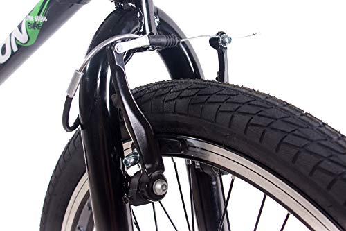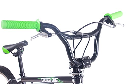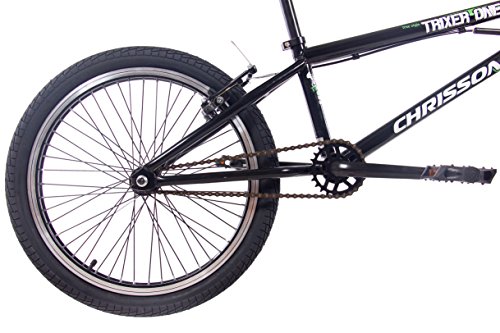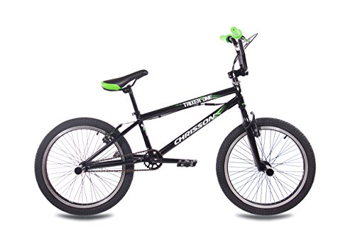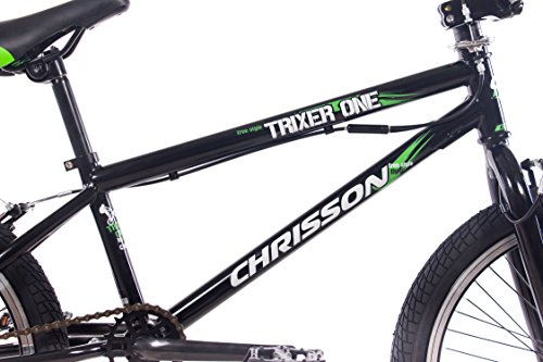 CHRISSON TRIXER ONEEin TOP BMX von CHRISSONNatürlich Made in EU!!in TOP Einsteger BMX von CHRISSONRAHMEN: CHRISSON TRIXER ONE – HI-TEN Stahlrahmen / Rahmenhöhe: 25cm GABEL: GW YS 07 – Stahlgabel STEUERSATZ: CC 878 F 360º Rotor System – Lenkersteuersatz 1 1/8 / 360 Rotor KETTENRAD, vorne: GW 142 – 25 Zähne, Stahlkurbel in schwarz KETTE: P 51 OH – 92NPPEDALE: FEIMIN FP-850B 1/2'NABEN: GW – 10mm verstärkte Achse LEERLAUF: GW 16T – 16 Zähne 1/2 x 1/8& FELGEN: SPEED schwarz – Alufelgen / HochflanschSPEICHEN: SLEE – 48 Speichen 14G W/CP mit 12mm Speichennippel REIFEN: KENDA K841 – 20 x 1.95, schwarz LENKER: GW YL-865 Stahl, Breite: 660mm GRIFFE: HL-G105 – grün / Freestyle VORBAU: AHEAD – 50mm extern für 360 Rotor SATTEL: P802C – BMX CORE Style Sattel SATTELSTÜTZE: GW – Stahl, Länge: 300mm, ? 25,4mm SATTELKLEMME: PROMAX – schwarz ALU Körper VORDERBREMSE: VB-967DK ALU V-Bremse HINTERBREMSE: VB-967DK ALU V-Bremse BREMSHEBEL: VBL-09A – Aluminium schwarz 2 Finger Verpackung: Fabrikneu und Originalverpackt! Um eventuelle Transportschaden zu vermeiden, sind die Fahrräder nicht zu 100%, sondern zu 85% vormontiert! Sie müssen nur noch Lenker, Pedale, Vorderrad und Sattel montieren. In seltenen Fällen ist auch leichtes Nachjustieren notwendig. Eine Montageanleitung bekommen Sie in elektronischer Form (PDF) nach dem Kauf.