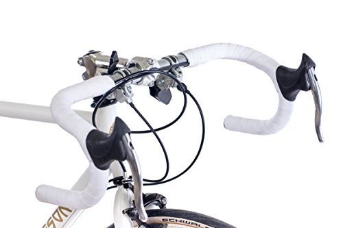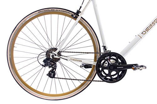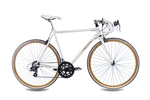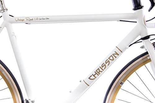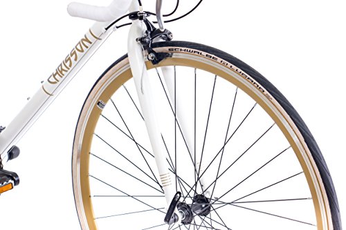 Ein TOP Vintage Rennrad mit moderner Technik! Einfach CHRISSON!Wir bieten das Fahrrad in drei Rahmengrössen: 53cm, 56cm und 59cm TECHNIK:> RAHMEN: HI TEN Vintage Rahmen / Rahmenhöhe: 53cm, 56cm oder 59cmGABEL: HI-TEN Rigid GabelSTEUERSATZ: NECO-845 BK Lenkersteuersatz Ø 1 1/8'KETTENRAD, vorne: SHIMANO A070 Aluminium schwarz 34-50 Zähne, 170mmKETTE: KMC Z 50PEDALE: FEIMIN Aluminium Alukörper mit LichtreflektorenSCHALTWERK: SHIMANO RD A070 D 7 SchaltgängeUmwerfer: SHIMANO FD A-050 DOWN PULLSCHALTHEBEL: SHIMANO SL A 050 7R/2L 14 GängenRITZELPAKET / LEERLAUF: SHIMANO TZ21 Mehrfacher Leerlauf in allen 7 Gängen FELGEN: CHRISSON DOUBLE WALL Aluminium SPEICHEN: SLEEREIFEN: SCHWALBE LUGANO 700x23CLENKER: PROMAX HB 2035, Breite: 440mm GRIFFE: HERRMANS LenkerüberzugVORBAU: ZOOM HE-C80D-2 AHEADSATTEL: LIBERTY by SM Made in ItalySATTELSTÜTZE: ZOOM SP 232 Aluminium Länge:300mm, Ø 27,2mmSATTELKLEMME: ZOOM AluschelleVORDERBREMSE: PROMAX Aluminium, DUAL PIVOT RennbremseHINTERBREMSE: PROMAX Aluminium, DUAL PIVOT RennbremseBREMSHEBEL: PROMAX BL 250 Aluminium Hebel W/RESIN CLAMP VERPACKUNG: Fabrikneu und Originalverpackt! Um eventuelle Transportschaden zu vermeiden, sind unsere Fahrräder nicht zu 100%, sondern zu 85% vormontiert! Sie müssen nur noch Lenker, Pedale, Räder und Sattel montieren. In seltenen Fällen ist auch leichtes Nachjustieren der Bremsen und/oder der Schaltung notwendig. Eine Montageanleitung bekommen Sie in elektronischer Form (pdf) per Email zugeschickt.