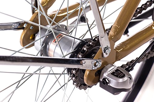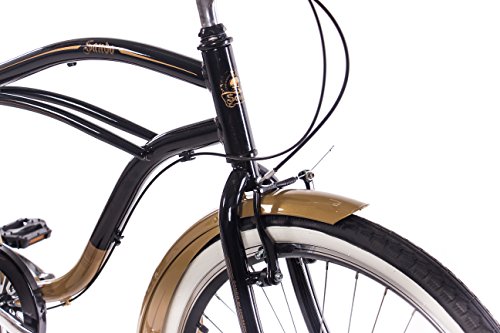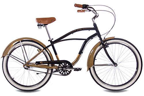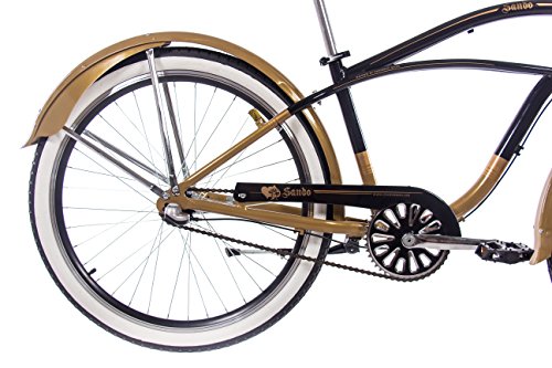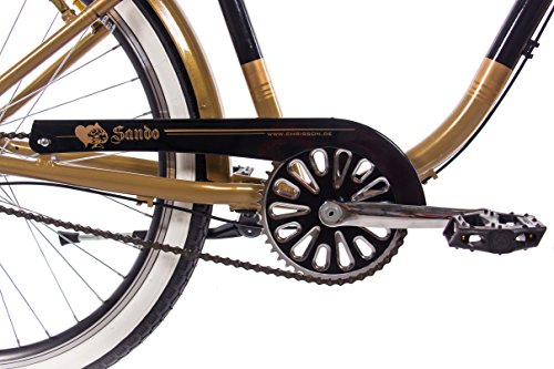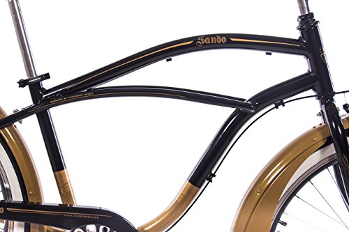 CHRISSON SANDO 3G – ein Aluminium Beachcruiser der Oberliga für kleines Geld! Mit SHIMANO NEXUS 3 Gang Nabenschaltung!! Wir empfehlen das Rad für eine Körpergröße zwischen 1m55 und 1m80! Einige Highlights: Aluminium 7005 Rahmen mit Unterlackdekoren, Sattel und Griffe Made in Italy…. TECHNIK: RAHMEN: Aluminium 7005 Rahmen / RH: 41cm GABEL: Hardfork HI TEN STEUERSATZ: NECO H841 KETTENRAD: DOTEC OPC 3-teilig, 44 Zähne, 170 mm KETTE: KMC Z33 PEDALE: FEIMIN 836 breite Platte SCHALTUNG: SHIMANO SMGEAR 3 Gang Nabenschaltung mit Rücktritt SCHALTHEBEL: SHIMANO REVOSHIFT 6 Gang RÜCKTRITT: SHIMANO NEXUS Getriebenabe mit Rücktritt FELGEN: CHRISSON Aluminium Aero SPEICHEN: SLEE silver REIFEN: KENDA K130A 26 x 2.125 schwarz weiss LENKER: ZOOM TR oversized / 700mm Breite GRIFFE: SKAY Leder 0014 von Selle Montegrappa Italy HANDMADE VORBAU: PROMAX Alloy SATTEL: LAGUNA XC100 Selle Monetgrappa Italy SATTELSTÜTZE: ZOOM ALU 300mm / 27,2mm SATTELKLEMME: PROMAX QR VORDERRADBREMSE: LOGAN TX V-Bremse HINTERRADBREMSE: LOGAN TX V-Bremse und SHIMANO NEXUS Rücktrittsbremse BREMSHEBEL: PROMAX Aluminium- Kunststoffausführung 2,5 Finger VERPACKUNG: Fabrikneu und Originalverpackt! Um eventuelle Transportschaden zu vermeiden, sind unsere Fahrräder nicht zu 100%, sondern zu 85% vormontiert! Sie müssen nur noch Lenker, Pedale, Räder und Sattel montieren. In seltenen Fällen ist auch leichtes Nachjustieren der Bremsen und/oder der Schaltung notwendig. Eine Montageanleitung bekommen Sie in elektronischer Form (pdf) per Email zugeschickt.
