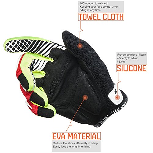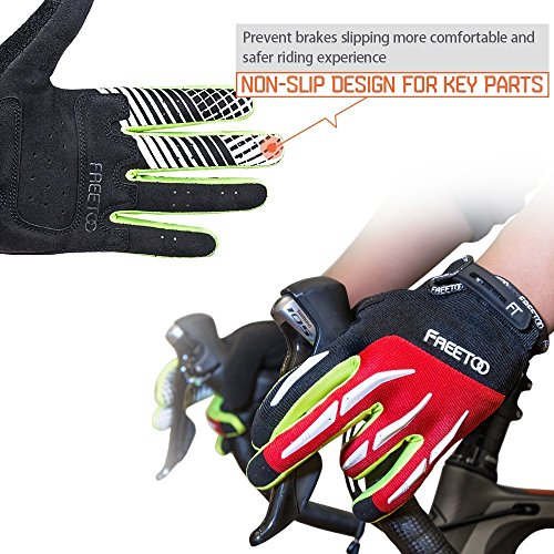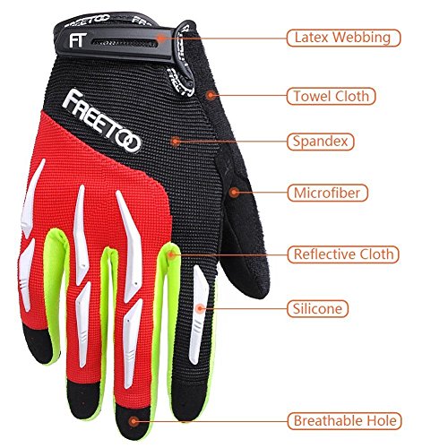 FREETOO Vollfinger Fahrrad Handschuhe, die für einen vollständigen Schutz auf Radsport ausgelegt wird, ist die perfekte Wahl für Fahrer, die ein Paar leichte, vielseitige vollfinger Handschuhe zu einem erschwinglichen Preis wünschen. Features: – Bequem und atmungsaktiv: Mikroporen auf Finger und Palmen lassen Sie die Hitze und evakuieren Palm Feuchtigkeit, so dass es sehr angenehm zu tragen; -Easy-on und Easy-off: die ergonomische Handgelenk mit Zuglasche ermöglicht es Ihnen, sie fest zu tragen ; – Perfekter Halt und Kontrolle: Silizium wird zu den Fingerspitzen hinzugefügt, um Abrieb zu erhöhen, und hob Kissen auf Palm um Vibrationen zu absorbieren; – Sicherer Nachtfahrten: mit fluoreszierenden außen und stark reflektierende Details, werden Sie mehr Sichtbar, um Ihre Sicherheit zu garantieren; -Stilvolles kompaktes Design: es scheint wunderschön und kühl auf der Hand aus. Es ist auch leichtgewichtig, was mehr flexibel für Ihre Hände; . Spezifikation: Nettogewicht: 62g; Farbe: schwarz und rot; Aktivität: Fahrrad , Radfahren,Road Race, Mountainbike; Material: 40% Kunstleder, 18% Elasthan, 12% Elasthan, 10% Nylon-Mesh, 5% Gummi, 2% Schaum, 3% Neopren, 2% PU, 3% Frottee und 5% anderen Materialien . Hinweis: 1.Handwäsche empfohlen; 2.Nach Gebrauch waschen Sie die Radsport Handschuhe vor der Lagerung, um Geruch zu vermeiden. 3.Die Fahrrad Handschuhe sind in kleiner Größe ausgelegt, so wählen Sie bitte eine größere Handschuhe als üblich.