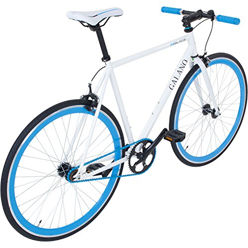 Galano Blade Das Galano Blade Eingangrad fährt durch die Stadt, wie das Messer durch die Butter. Hergestellt aus stabilem Hi-Ten-Stahl, mit bissigen Dual Pivot-Seitenzugbremsen, 700c x 28c Reifen und genialen Farbaplikationen. Natürlich mit Flip Flop-Naben für alle Fixie-Fans. In den Rahmengrößen 53 cm, 56 cm oder 59 cm erhältlich. Für alle Fans des schlichten Designs wurde bewusst auf große Aufkleber verzichtet. Des weiteren sind sie nicht überlackiert und somit entfernbar. Daher eignet es das Bike perfekt als Grundlage für ein individuelles Custom Singlespeed. Technische Daten:Hersteller: Galano Modell: Blade Farben: Schwarz/Rot, Weiß/Rot, Schwarz / Grün oder Weiß / Grün Rahmen: Hi-ten Legierungsstahl, integrierter Kettenspanner Rahmengröße: 53 cm, 56 cm oder 59 cm Reifen: 700 x 28c Felgen: Hochflansch Aluminium double wall Naben: Quando Qualitätsnaben, Hinten: Flip Flop Nabe (Fixed / Freilauf)Gänge: 1 Kettenblatt: 46 Zähne, Stahl Kurbelsatz: 170 mm Pedale: Kunstoff BMX Style Bremsen: Radius, Aluminium Calliper Dual Pivot Bremshebel: Radius, Aluminium, InlineGabel: Hi-ten LegierungsstahlVorbau: Ahead, 28.6 mm 100 mm, StahlLenker: Stahl Straight Type 480 mmSattel: VaderSattelstütze: Zoom Gewicht: 11,8 kg Zubehör: + Reflektoren + Klingel + Kettenschutz
