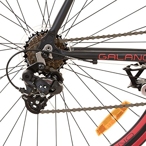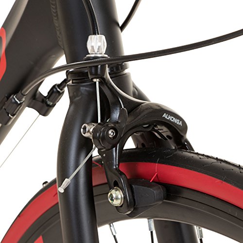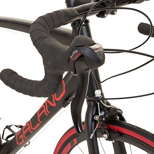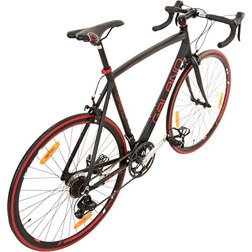 Technische Daten: Hersteller: Galano Modell: Vuelta Sti Rahmen: Aluminium Road hydroformed frame Design Farbe: weiß/orange oder schwarz/rot Rahmengrößen: 50 cm, 53 cm, 56 cm, 59 cm, 62 cm Reifen: 700c x 23c Meghna MR-7031 Straßenprofil Felgen: Trondheim Aluminium Hohlwand-Felgen 700c Speichen (v/h): 36 / 36 Nabe Hinten: Quando KT Nabe KT-511R Nabe Vorne: Quando KT Nabe KT-515F Gänge: 14 Schalthebel: Shimano ST-A070 Schalt-/Bremshebel Kombi Schaltwerk: Shimano RD-A050 Umwerfer vorne: Shimano FD-A050 Kassette: Shimano Freilauf, 7-fach 14 – 28 Zähne Kettenblatt: 42 / 52 Zähne Kurbelsatz: Prowheel A1-220 170 mm Aluminium Pedale: Kunststoff mit Pedalhaken Bremsen: Tektro Calliper-Bremse Dual Pivot Power CBR-3000A Bremshebel: Shimano – Sti Schalt-Bremshebel Gabel: HI-TEN Stahl 700c Schwarz Vorbau: Neco A-Head 90 mm Aluminium Steuersatz: Neco Low Stack A-Head Griffe: Viking Lenkerband, Farbe schwarz Lenker: Zoom Rennlenker HB-3035 Stahl Breite: 410 mm Drop: 125mm Sattel: Viking Road Sattel Sattelstütze: Micro Adjust Aluminium Gewicht: 11,9 kg Zubehör: Reflektoren, Klingel Lieferzustand: 85% vormontiert. Lenker, Sattel, Pedale und Vorderrad sind zu montieren.