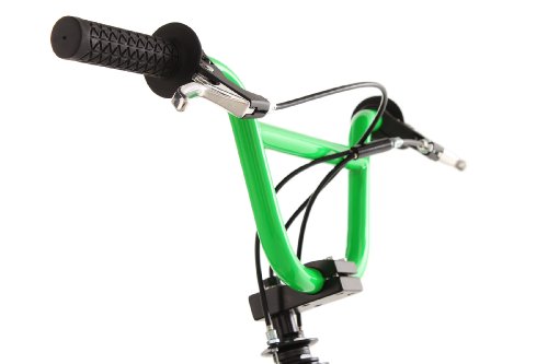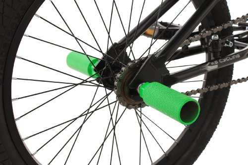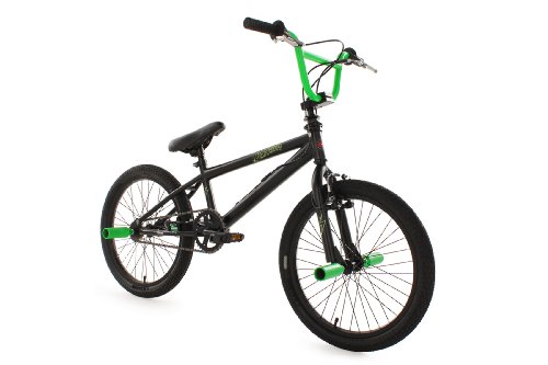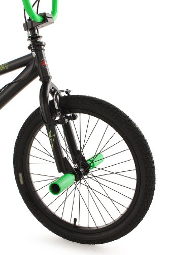 Das BMX-Rad „DYNAMIXXX“ von KS Cycling kommt im hammermäßigen BMX-Freestyle-Look und kombiniert den schlichten, matt-schwarzen Rahmen mit Lenker und Pegs in auffälligem, trendigem Lime-Grün.Ein stylischer optischer Kontrast, und Du wirst mit diesem BMX-Bike richtig fett ankommen. Auch in Sachen Technik kann man dem „DYNAMIXXX“ nichts vormachen! » 360°-Rotorsystem » 4 Pegs inklusive » 2 V-BrakesRahmen: Hi-Ten Freestyle-Stahlrahmen Gabel: BMX Freestyle-Gabel 1″ Gabelschaft Steuersatz: 1″ für GewindegabelnVorbau: 1″ Aluminium-SchaftvorbauLenker: 2-teiliger Stahllenker Rotor: Standard-360°-Rotorsystem Griffe: BMX-Griffe mit Flansch Bremshebel: Aluminium / Komposit Bremsen: Aluminium-V-Brakes Felgen: Aluminium, 36° Naben: Stahlnaben, 10 mm-Achsen Reifen: Freestyle-Reifen 20″ x 2,0″ (54-406) Kurbel: 1-teilige Stahlkurbel Kettenblatt: Stahl 36T Pedale: Kunststoff-Plattformpedale 1/2″ Sattel: BMX-Freestyle-Sattel Zubehör: Kettenschutz, 4 Stahlpegs Gewicht: ca. 13 kg