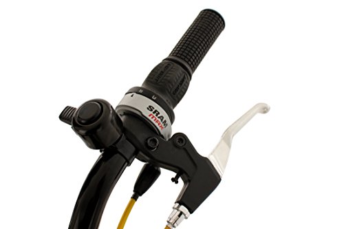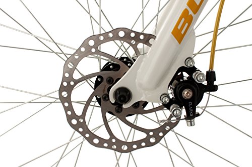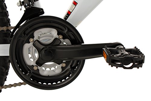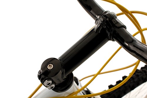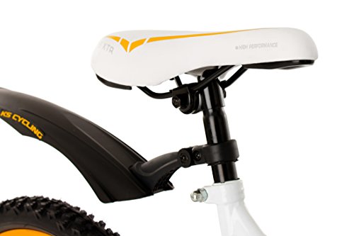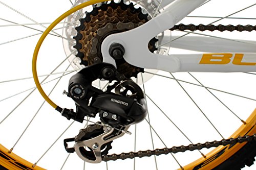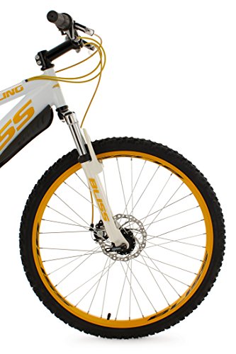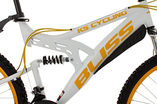 Stürzen Sie sich ins Abenteuer Mountainbiking: mit dem BLISS von KS Cycling! Das vollgefederte 26″-Mountainbike kommt ganz in Weiß mit schwarzen Anbauteilen und knallgelben Felgen und Decals. Auch Spritzschutz und Sattel sind aufs Design voll abgestimmt. Diese Hammer-Optik steht überall im Mittelpunkt!Das Bike ist mit einer SHIMANO 21-Gang-Schaltung ausgestattet, die komfortabel und intuitiv über SRAM Drehschaltgriffe bedient wird. Durch den voll gefederten Rahmen behalten Sie auch auf holprigen Strecken immer die Kontrolle. Für die sichere Verzögerung in jeder Situation sorgen dabei zwei Scheibenbremsen. » Federgabel und gefederter Rahmen » Rahmen in Y-Form » SHIMANO 21-Gang-Schaltung » SRAM Drehschaltgriffe » Scheibenbremsen Rahmen: Gefederter Hi-Ten Stahlrahmen Rahmenhöhe: 47 cm Gabel: Federgabel mit 1″ Ahead-Schaft Steuersatz: 1″ Ahead-Steuersatz Vorbau: 1″ Aluminium-Ahead-Vorbau Lenker: Stahllenker Naben: Stahlnabe vorne, Stahl-Schraubkranznabe hinten Reifen: KENDA Stollenreifen 26″ x 1,95″ (50-559) Felgen: KS Aluminium-Hohlkammerfelgen mit Verschleißindikator  Schaltungstyp: 21-Gang-Kettenschaltung Schaltwerk: SHIMANO Tourney Umwerfer: POWER 3-fach Schalthebel: SRAM Drehschaltgriffe Ritzel: 7-fach Schraubkranz (14-28 Zähne) Kurbel: Stahlkurbel mit 3 Kettenblättern und Hosenring (42-34-24 Zähne) Innenlager: THUN Patronenlager BSA 68  Pedale: Kunststoffpedal 9/16″ Sattel: KS XTR MTB-Sattel Sattelstütze: Stahl-Kerzenstütze Ø 25,4 mm Sattelklemmung: Schnellspanner Bremse: CLARKS mechanische Scheibenbremsen vorne und hinten  Bremshebel: Aluminium/Komposit Gewicht: ca. 18,4 kg