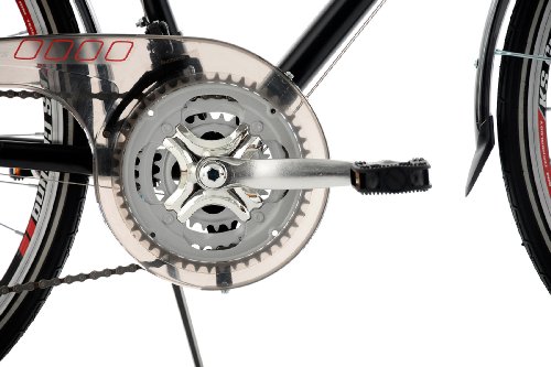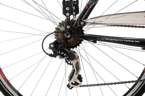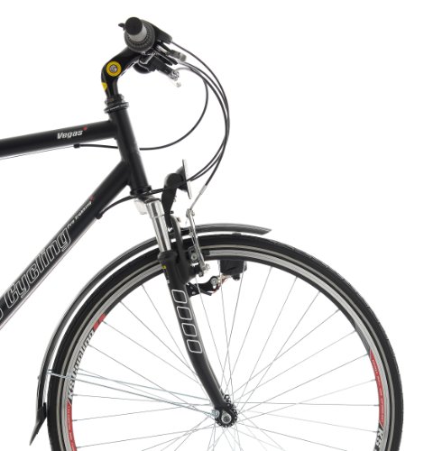 Ob Sie bequem durch die Stadt fahren oder eine längere Tour planen möchten: Das 28″ Trekking-Herrenfahrrad VEGAS von KS Cycling ist immer mit dabei! Das Fahrrad hat einen schwarzen Rahmen mit eleganten weißen Details. Der transparente Kettenschutz rundet das Design ab. Mit der SHIMANO Kettenschaltung mit 21 Gängen sind Steigungen kein Problem mehr. Dank der Federgabel sind kleine Unebenheiten auf der Strecke fast nicht mehr zu spüren. So wird jede Fahrt mit dem Trekkingrad zum Genuss. Rahmen: Stahlrahmen Rahmenhöhe: 53 cm Gabel: ZOOM 1 1/8″ Federgabel mit Gewindeschaft Steuersatz: 1 1/8″ Gewindesteuersatz für Gewindegabeln Vorbau: 1 1/8″ verstellbarer Aluminium-Schaftvorbau Lenker: Stahl Naben: Stahlnabe vorn, Schraubkranznabe hinten Reifen: Trekkingreifen mit Reflexstreifen 700x35c (37-622) Felgen: Aluminium-Hohlkammerfelgen Schaltungstyp: 21-Gang-Kettenschaltung Schaltwerk: SHIMANO Tourney TX Umwerfer: SHIMANO Umwerfer FD-TZ31 Schalthebel: SHIMANO RevoShift SL-RS 35 Drehschalthebel Ritzel: SHIMANO 7-fach-Schraubkranz (Abstufung 13-28 Zähne) Kurbel: Stahl-Kurbel mit 3 Kettenblättern (Abstufung 28-38-48 Zähne) Innenlager: Patronenlager BSA 68 Pedale: Kunststoff-Pedale Gepäckträger: Stahl mit Federklappe (18 kg Zuladung max.) Schutzbleche: Bruchsicherer Kunststoff Sattel: Trekkingsattel Sattelstütze: Stahl-Kerzenstütze Ø 25,4 mm Sattelklemmung: Aluminium-Schnellspannhebel Bremse: Aluminium-V-Brakes Bremshebel: Aluminium-/Komposit-Bremshebel Scheinwerfer: AXA Basta Halogenscheinwerfer (dynamobetrieben) Rücklicht: AXA Basta Ray Rücklicht (batteriebetrieben) Dynamo: AXA Basta Duo Ständer: Aluminium-Seitenständer Zubehör: Kettenschutz, Klingel Gewicht: ca. 19 kg