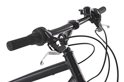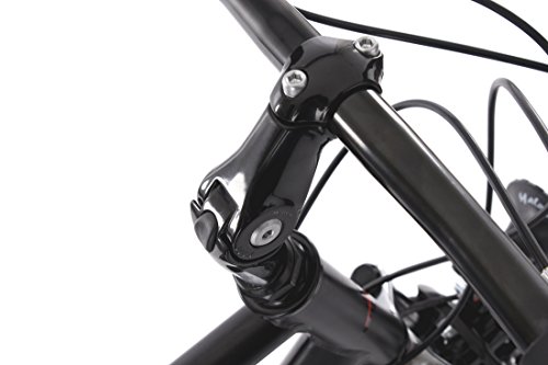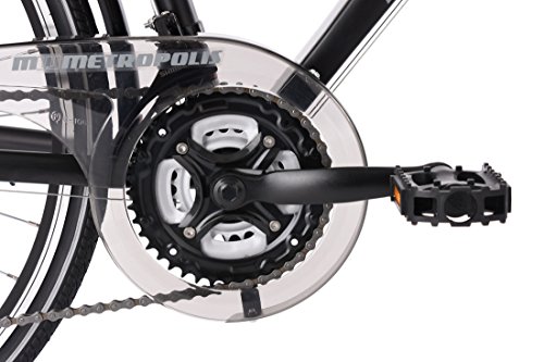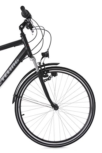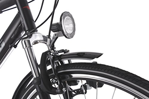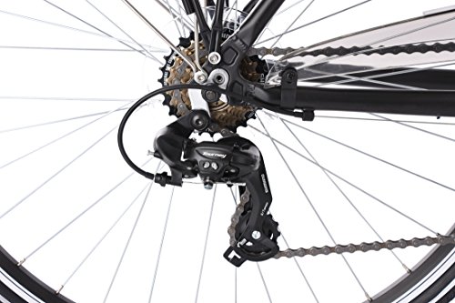 Das Fahrrad hat einen schwarzen Rahmen mit eleganten grauen Details. Der transparente Kettenschutz rundet das Design ab.Mit der SHIMANO Kettenschaltung mit 21 Gängen sind Steigungen kein Problem mehr. Dank der Federgabel sind kleine Unebenheiten auf der Strecke fast nicht mehr zu spüren. Selbstverständlich ist das Fahrrad zudem mit einer Beleuchtungsanlage gemäß StVZO ausgerüstet.Rahmen: Alu-RahmenRahmenhöhe: 56 cmFarbe: SchwarzGabel: Federgabel (Federweg 30 mm) mit 1 1/8″ GewindeschaftSteuersatz: 1 1/8″ Gewindesteuersatz für GewindegabelnVorbau: 1 1/8″ verstellbarer Aluminium-SchaftvorbauLenker: Stahl-RiserbarNaben: Stahlnabe vorne, Stahl-Schraubkranznabe hintenFelgen: Alu-HohlkammerfelgenReifen: Trekkingreifen mit Reflexstreifen 700x35c (37-622)Gänge: 21 GängeSchaltwerk: SHIMANO TourneyUmwerfer: SHIMANOSchalthebel: SHIMANO RevoShift DrehschaltgriffeRitzel: SHIMANO MF-TZ21 Schraubkranz (Abstufung 13-28 Zähne)Kurbel: Stahl-Kurbeln mit 3 Kettenblättern (Abstufung 28-38-48 Zähne)Innenlager: Patronenlager BSA 68Pedale: Kunststoff-PedaleGepäckträger: Stahl mit Federklappe (25 kg Zuladung max.)Schutzbleche: bruchsicherer KunststoffSattel: TrekkingsattelSattelstütze: Stahl-Kerzensattelstütze Ø 27,2 mmSattelklemmung: Klemmring mit SchraubeBremse: Alu-V-BrakesBremshebel: Alu/KompositScheinwerfer: HalogenscheinwerferRücklicht: Gepäckträgerrücklicht (batteriebetrieben)Dynamo: Seitenläufer-DynamoZubehör: Kettenschutz, KlingelGewicht: ca. 16,7 kg