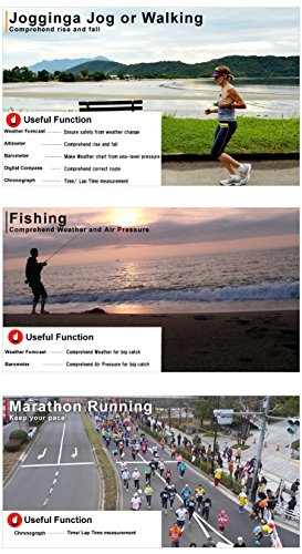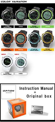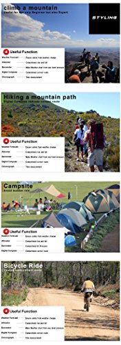 [Funktionen] ■Deutscher Sensor ■Wettervorhersage (Sonnig/ Bewölkt und sonnig/ Bewölkt/ Regen) ■Altimeter -Höhenmesser (zeichnet automatisch stündlich auf) -Meter (m) oder Fuß (ft) -Höhenmesser (zeichnet bis zu 34 stündliche Daten auf) ■Streckenmodus (Relative Höhe : Es kann zwischen dem Start und dem Ende die steigende oder sinkende Höhe messen.) ■Barometer -Meeresspiegeldruckmesser (Speichert bis zu 34 vergangene, stündliche Daten) -mb, hPa oder inHg ■Digitaler Kompass -Magnetische Deklination -Kalibrierung ■Thermometer -Celsius (°C) oder Fahrenheit ■Chronograph -Misst die verstrichene Zeit -Misst die Rundenzeit (Bis zu 10 Runden) -Zeitraum: 99 Stunden 59 Minuten 59,99 Sekunden ■Timer -Countdown-Timer -Zeitraum: 99 Stunden 59 Minuten 59,99 Sekunden -Timersounds (Hörbar für 30 Sekunden wenn auf Null herunter gezählt wird.) ■Dualer Zeitmodus ■Täglicher Alarm (Täglicher Alarm 1 und 2 arbeiten unabhängig voneinander) ■Kalender für Tag und Datum -Format MM/DD oder DD/MM ■Stromsparmodus ■Elektrolumineszente Rückbeleuchtung ■Wechsel zwischen 12-Stunden- und 24-Stunden-Modus [Größe] ・Gehäusedurchmesser: 45 mm / Stärke: 13 mm ・Armbandlänge: 150-220 mm / Breite: 22 mm ・Gewicht: 57 g [Zubehör] ・Originalbox ・Bedienungsanleitung (Englisch)