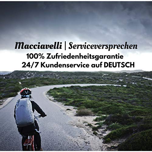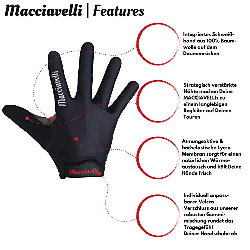 Was zeichnet deine MACCIAVELLIs aus? Fahrradhandschuhe für Deinen Alltag, abenteurliche Touren oder den WettkampfbereichGeeignet für den Gebrauch mit Rennrädern, Mountainbikes, Trekkingrädern, Bahnrädern und vielem mehr Die richtige Größe für jeden – Männer, Frauen und Kinder – solltet ihr die Haandschuhe dennoch in der falschen Größe bestellt haben ist der Umtausch kostenlos, schnell und unkompliziert Beispielloser Service von Radfahrern für Radfahrer – vor und nach dem KaufSchlichtes und funktionelles Design Flexibel und atmungsaktiv – die hochelastische Lycra-Membran schmiegt sich an wie eine zweite Haut und hilft eurem Körper bei der natürlichen TemperaturregulierungKomfortabel – strategisch platzierte 3-Wege-Geleinlagen sorgen für eine perfekte Polsterung und erhöhen Dein DurchhaltevermögenKein Gefummel – die EASY-OFF Schlaufen ermöglichen euch ein sekundenschnelles Ausziehen eurer MACCIAVELLIs Robust & Haltbar – verstärkte Nähte machen die Radhandschuhe zu eurem treuen, jahrelangen BegleiterBeruhigender Schutz – die Kombination aus robustem Kunstleder und schockabsorbierenden Geleinlagen fängt und schützt euch souverän bei Stürzen