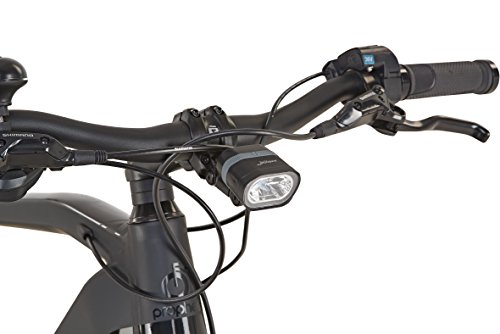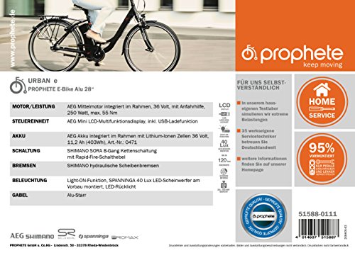 Eleganz und Minimalismus auf ganzer Linie zeichnet unser PROPHETE URBAN aus. Grund dafür ist vor allem eine Neuheit: Das vollintegrierte Antriebssystem von AEG. Es verleiht dem E-Bike Leichtigkeit und eine zeitlose Form. Der 403 Wh-Akku ist zentral im Unterrohr positioniert. Durch den mittigen Schwerpunkt profitieren Sie von einem sicheren Fahrgefühl – nahezu wie bei einem Fahrrad ohne Motor. Die Integration in den Rahmen schützt den Akku zudem vor Schmutz und Schäden. Auf dem Mini LCD-Multifunktionsdisplay haben Sie wichtige Informationen im Blick: Die Unterstützungsstufe genauso wie die Geschwindigkeit und den Akkuladestand. Zusätzlich können Sie über den USB-Anschluss Ihr Smartphone aufladen.Mit der 8-Gang-Kettenschaltung von Shimano wechseln Sie zügig in den gewünschten Gang. Kräftig packen die hydraulischen Shimano-Scheibenbremsen zu, wenn Sie in den Stand kommen möchten. Dabei leuchtet der 40 LUX-LED-Scheinwerfer weiter, denn er wird vom Akku dauerhaft mit Strom versorgt. Komfort bietet die Ballonbereifung, die Stöße leicht sanft abdämpft. Auch an den Rädern zeigt sich das avantgardistische Design – die schwarzen Speichen führen die Eleganz des Rahmens weiter. Das ist moderner Stil bis ins Detail!Was noch hervorzuheben ist, ist das Ihnen Prophete während der Gewährleistungszeit einen kostenlosen vor Ort Service bietet. Dieser Service wird in der Regel innerhalb von 14 Tagen vom Kundendienst Monteur beim Kunden zu Hause erledigt, somit werden eventuelle Reklamationen schnell und einfach erledigt.Motor: AEG Mittelmotor, 36 Volt, mit AnfahrhilfeLeistung: 250 Watt, max. 55 NmSteuereinheit: AEG Mini LCD-Multifunktionsdisplay, inkl. USB-LadefunktionAkku: AEG Akku integriert im Rahmen mit Lithium-Ionen Zellen, 36 Volt, 11,2 Ah (403Wh)max. Reichweite: ca. 120 km (je nach Fahrweise)Schaltung: SHIMANO ACERA 8-Gang Kettenschaltung mit Rapid-Fire-SchalthebelBremsen: SHIMANO hydraulische ScheibenbremsenBeleuchtung: Light-ON-Funktion, SPA