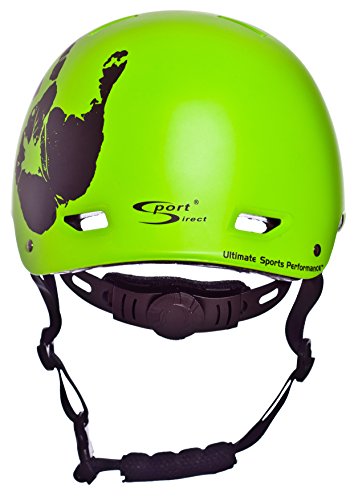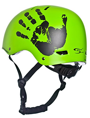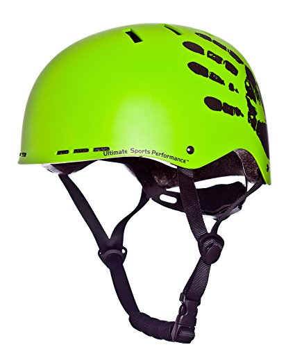 Eine große grüne BMX Helm, hat eine schwarze Hand-Print. Dies ist ideal für Reiten BMX, Skateboarding, Roller Blading und andere Extremsport. Dieser Helm hat 9 AbkГјhlungen Öffnungen mit einem geschützten Mikro-Sieb-Insekt-Grill und ein Komfort-Kinnriemen.